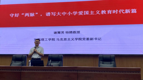 sunbet官网党委副书记谢霄男在主题研修活动中作题为《守好“两脉”,谱写大中小学爱国主义教育时代新篇》的专题报告。谢霄男首先介绍了大中小学思政课一体化的由来,然后从守好中国人的“根脉”的重要性、守好中国人的“魂脉”的必要性、守好“两脉”要厚植爱党爱国情怀、守好“两脉”要坚持爱国、爱党、爱社会主义相统一等四个维度对大中小学爱国主义教育一体化的重要性与方法路径展开了深入讲解。